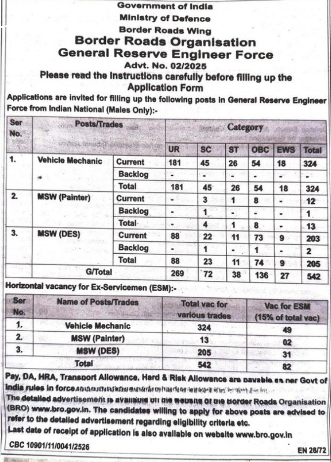 തിരുവനന്തപുരം: ഇന്ത്യൻ പ്രതിരോധ മന്ത്രാലയത്തിന് കീഴിലുള്ള ബോര്ഡര് റോഡ്സ് ഓര്ഗനൈസേഷനില് വെഹിക്കിള് മെക്കാനിക്, മള്ട്ടിസ്കില്ഡ് വര്ക്കര് തസ്തികകളിലേക്ക് ഇപ്പോൾ അപേക്ഷിക്കാം. ജനറല് റിസര്വ് എന്ജിനിയര് ഫോഴ്സിലാണ് ഒഴിവ്. പുരുഷന്മാര്ക്കാണ് അവസരം. വെഹിക്കിള് മെക്കാനിക് വിഭാഗത്തിൽ ആകെ 324 ഒഴിവുകളും, മള്ട്ടിസ്കിൽഡ് വര്ക്കര് (പെയിന്റര്) തസ്തികയിൽ 13 ഒഴിവുകളും മള്ട്ടിസ്കിൽഡ് വര്ക്കര് (ഡിഇഎസ്) തസ്തികയിൽ 205 ഒഴിവുകളും ഉണ്ട്. ആകെയുള്ള ഒഴിവുകളിൽ 82 ഒഴിവുകൾ വിമുക്തഭടന്മാര്ക്ക് സംവരണം ചെയ്തതാണ്. കൂടുതൽ വിവരങ്ങൾക്ക് https://bro.gov.in/, https://marvels.bro.gov.in/ സന്ദർശിക്കുക.