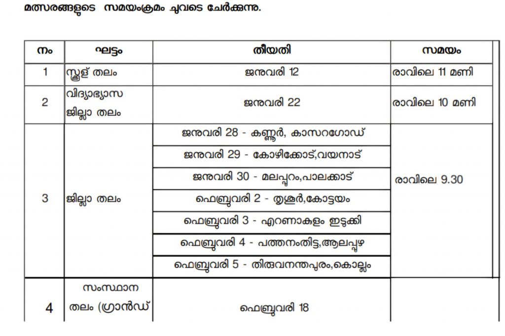 ജനുവരി 12ന് രാവിലെ 11ന് സ്കൂൾതല മത്സരം നടക്കും. ജനുവരി 22ന് രാവിലെ 10ന് വിദ്യാഭ്യാസ ജില്ലാതല മത്സരം. ജനുവരി 28മുതൽ ഫെബ്രുവരി 5വരെ, ഒരു ദിവസം 2ജില്ലകളിൽ വീതമായി ജില്ലാതല മത്സരം നടക്കും. ഫെബ്രുവരി 18നാണ് സംസ്ഥാനതല മത്സരം. മത്സരത്തിന്റെ സമയക്രമം താഴെ: