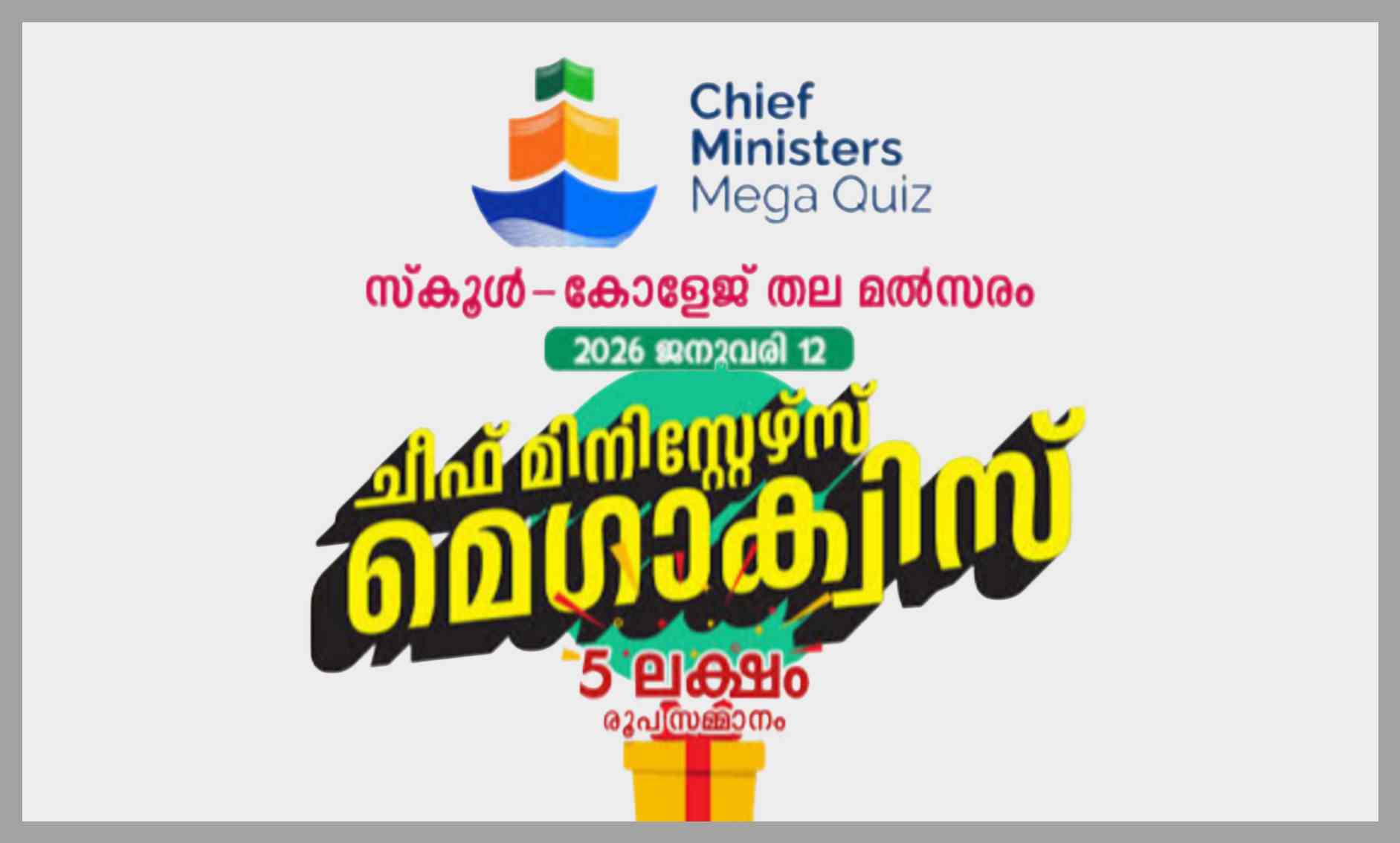 തിരുവനന്തപുരം:കേരളത്തിന്റെ സാമൂഹിക പുരോഗതിയുടെ ചരിത്രത്തെ ആസ്പദമാക്കി വിദ്യാർത്ഥികൾക്കായി സ്കൂൾ-ജില്ലാ- സംസ്ഥാന തലങ്ങളിൽ സംഘടിപ്പിക്കുന്ന ”ചീഫ് മിനിസ്റ്റേഴ്സ് മെഗാ ക്വിസ് മത്സര” ത്തിന് ജനുവരി 12 ന് തുടക്കമാകും. സംസ്ഥാനത്തെ പൊതുവിദ്യാഭ്യാസ വകുപ്പിന് കീഴിലുള്ള 8 മുതൽ 12 വരെ ക്ലാസുകളിലെ വിദ്യാർത്ഥികൾക്കും ഉന്നത വിദ്യാഭ്യാസ വകുപ്പിന് കീഴിലുള്ള സർവകലാശാല, കോളേജ് വിദ്യാർത്ഥികൾക്കും പ്രത്യേകം വിഭാഗങ്ങളിലായാണ് മത്സരങ്ങൾ നടത്തുന്നത്. സ്കൂൾ തല മത്സരത്തിൽ ഒന്നാം സ്ഥാനം നേടുന്നവർക്ക് അഞ്ച് ലക്ഷം രൂപയും രണ്ടാം സ്ഥാനക്കാർക്ക് മൂന്ന് ലക്ഷം രൂപയും മൂന്നാം സ്ഥാനക്കാർക്ക് രണ്ട് ലക്ഷം രൂപയും സമ്മാനമായി ലഭിക്കും.